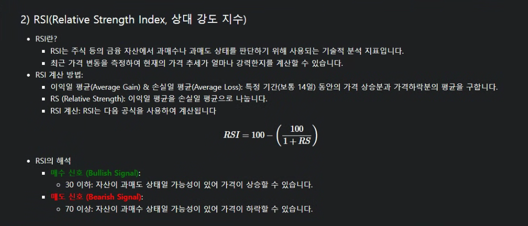 RSI 계산은 RS(Relative Strength, 상대 강도) 값을 구한 후, 최종 RSI 공식에 대입하는 방식으로 진행됩니다.
