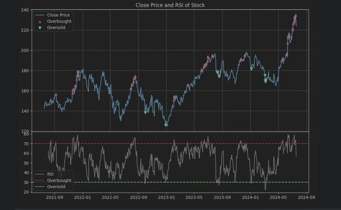 • 예시: D 주식의 가격이 최고점을 찍고 있지만, RSI는 하락세를 보인다면, 이는 상승 모멘텀 상실을 의미하므로 매도 타이밍으로 판단할 수 있습니다.